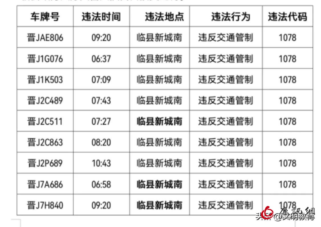 根据新冠肺炎疫情防控工作领导小组办公室于2022年10月8日发布的关于《临县实施临时性静默管理的通告》及临县公安局交通警察大队发布的紧急通知,临县全域内10月8日有下列车辆违反交通管制的交通违法行为。根据《中华人民共和国道路交通安全法》第九十九条规定,机动车违反交通管制的,予以罚款2000元,可以并处15日以下拘留。疫情期间,请自觉遵守疫情防控及交通安全有关规定,临县交警大队对违法者,按照相关规定依法予以严厉处罚,望广大司机朋友们引以为戒,切勿以身试法。下列车辆待解除临县临时性静默管理后,主动到临县政务大厅交警大队窗口接受处罚。