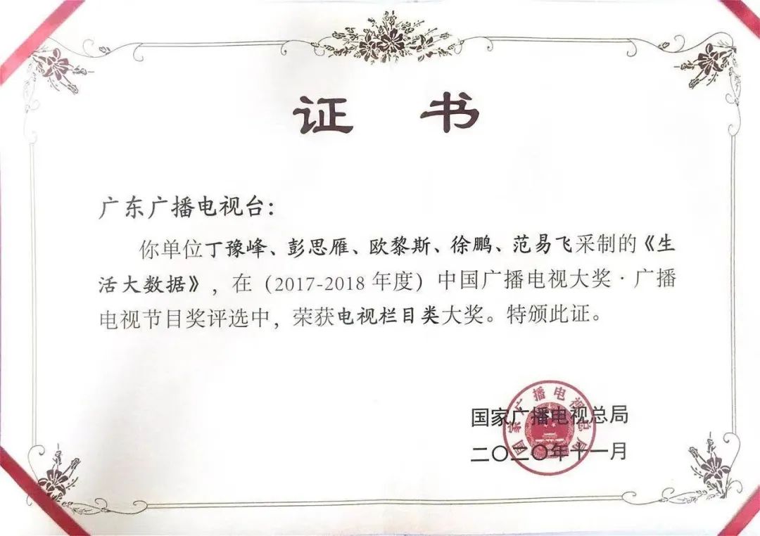 由国家广播电视总局主办、中国广播电视社会组织联合会承办的首届“中国广播电视大奖•广播电视节目奖”评选中,广东广播电视台广东卫视《生活大数据》栏目荣获“电视栏目类大奖”。
